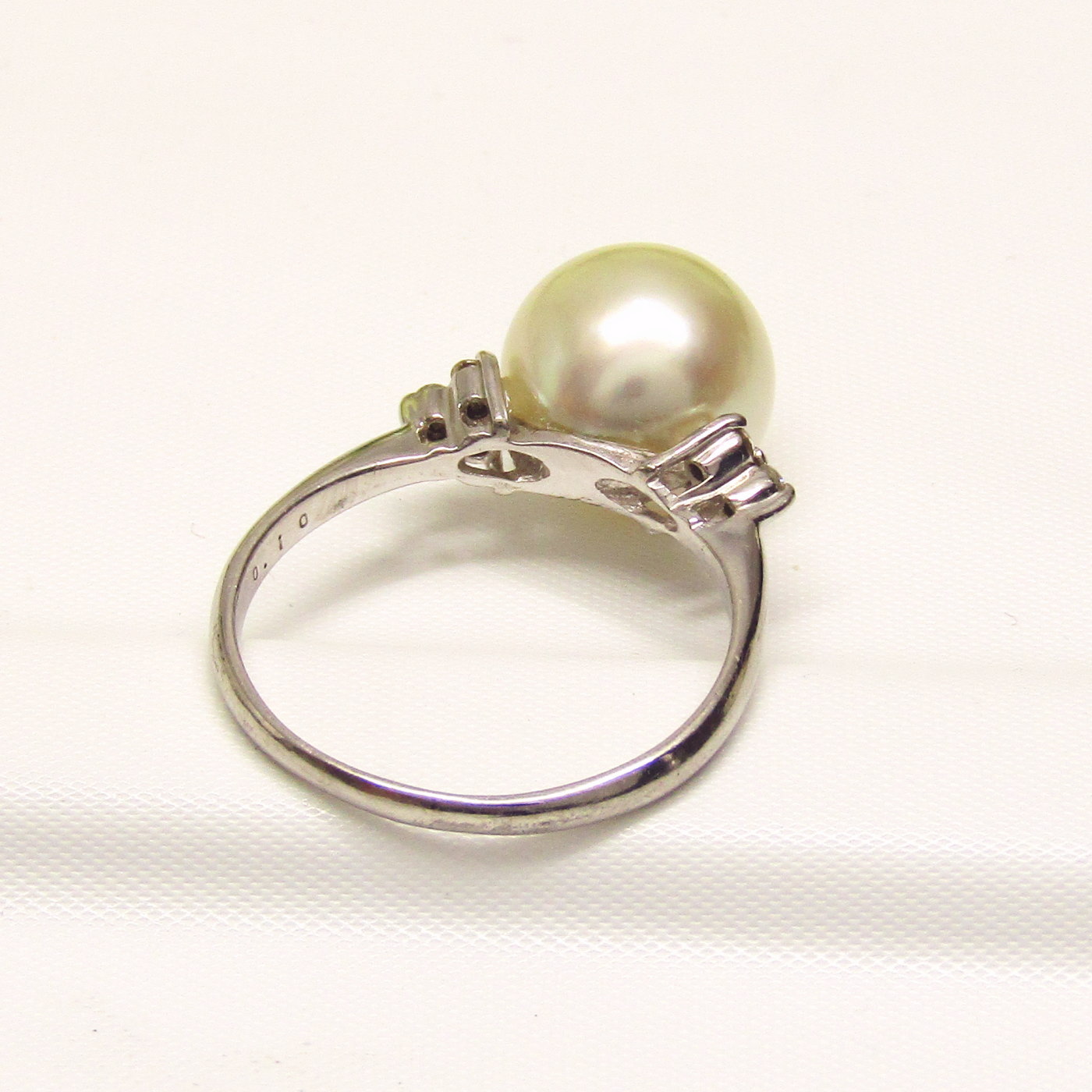 薄いゴールド系白蝶パールを使ったリングです。テリ、形の良い珠を使用しております。パールの左右にメレダイヤを留めたデザインですので、普段使いにもぴったりです。 手元をパッと明るく見せてくれるリングです。